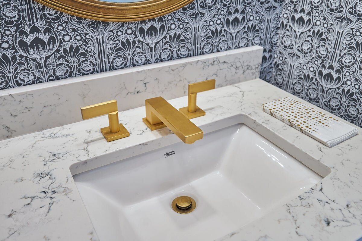 This contemporary powder room design in Yardley, PA is proof that the smallest room in the house can be the most stylish. The combination of colors and textures creates a stunning design that will make it a conversation piece for visitors to the home. The Jay Rambo floating vanity cabinet has a natural finish on Sapele with a Salerno door style. This is accented by a Caesarstone White Attica countertop, Top Knobs satin brass hardware, and a Sigma Stixx 8″ lever faucet. A decorative gold framed mirror sits against the backdrop of bold, black and white patterned wallpaper. Warm wood floors create a cozy atmosphere, and a Toto toilet completes this powder room.