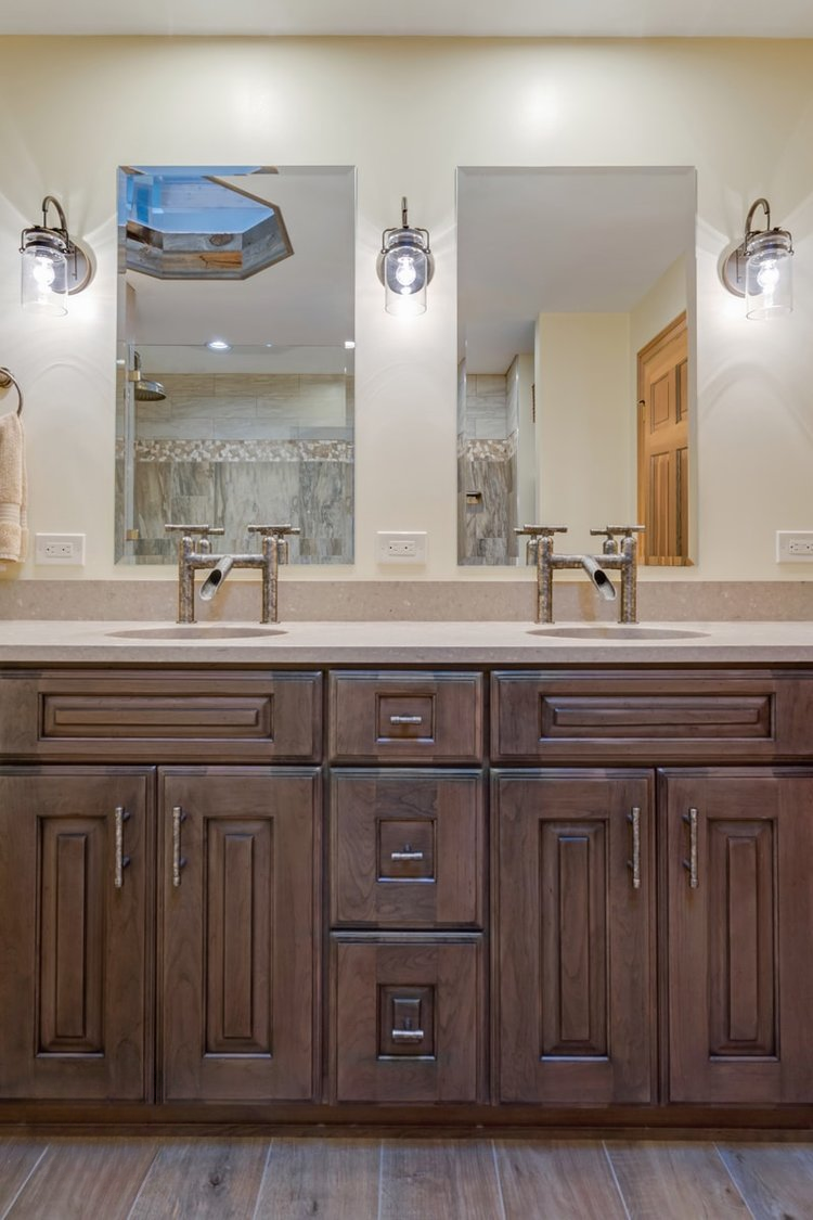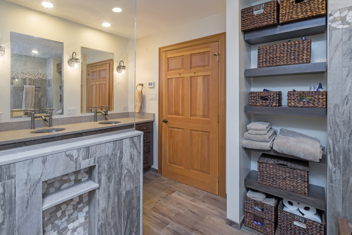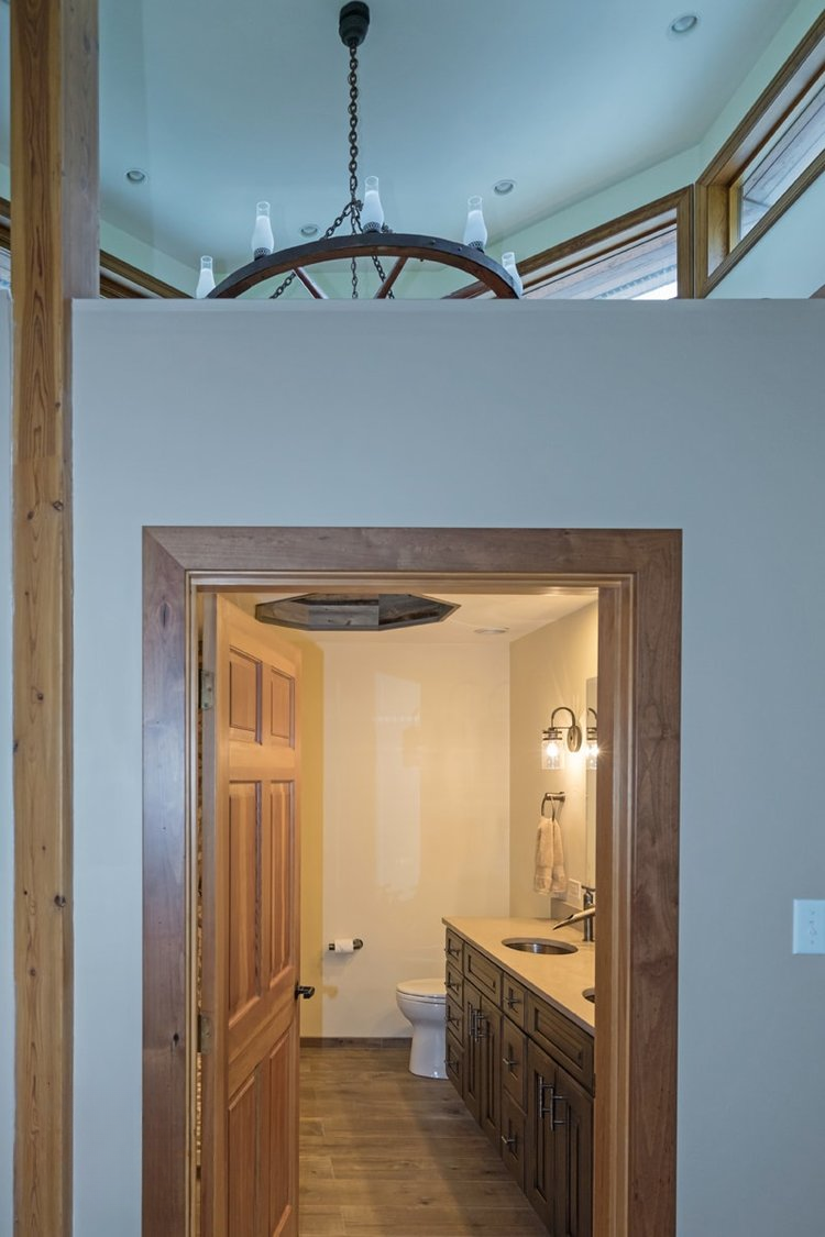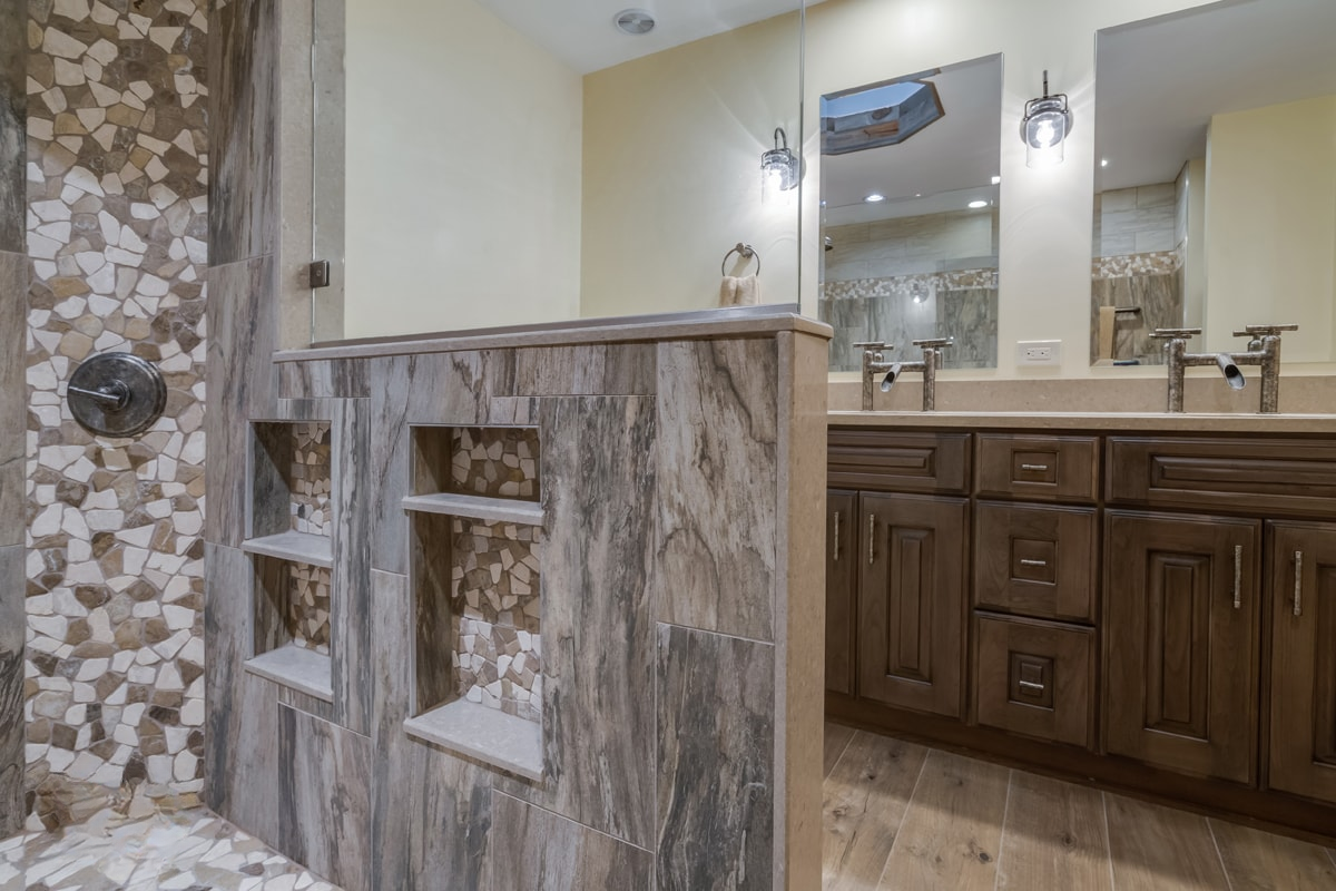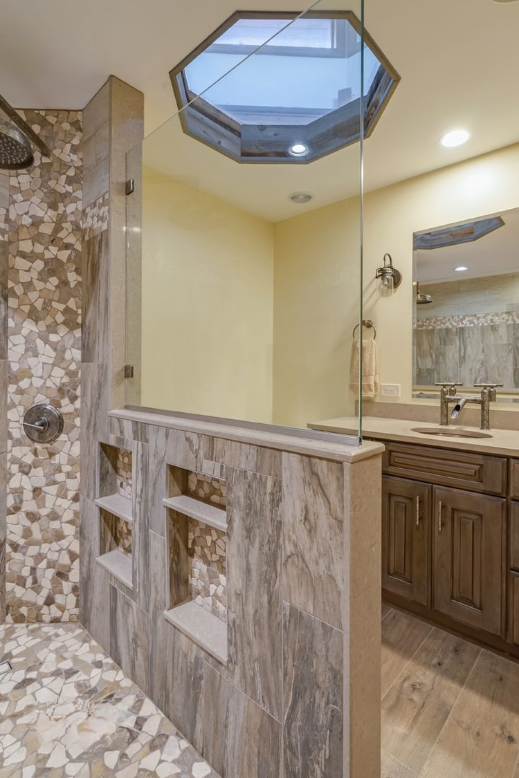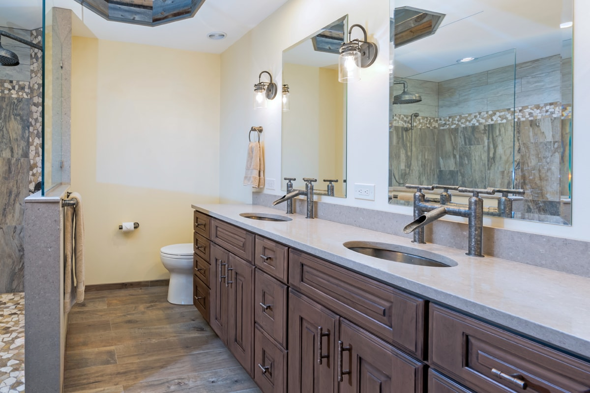 This bathroom design includes rustic and industrial features in a space that is unique, stylish, and relaxing. The master bath maximizes the space it occupies in the center of this unique octagonal-shaped house by creating an internal skylight that opens up to a high ceiling above the bathroom in the center of the home. It creates an architectural feature and also brings natural light into the room. The DuraSupreme vanity cabinet in a distressed finish is accented by a Caesarstone engineered quartz countertop and eye-catching Sonoma Forge Waterfall spout faucet. A thresholdless shower with a rainfall showerhead, storage niches, and a river rock shower floor offer a soothing atmosphere.
