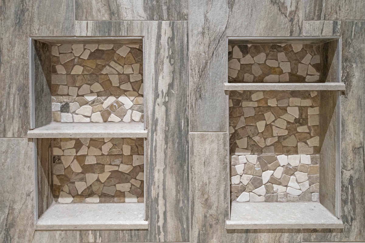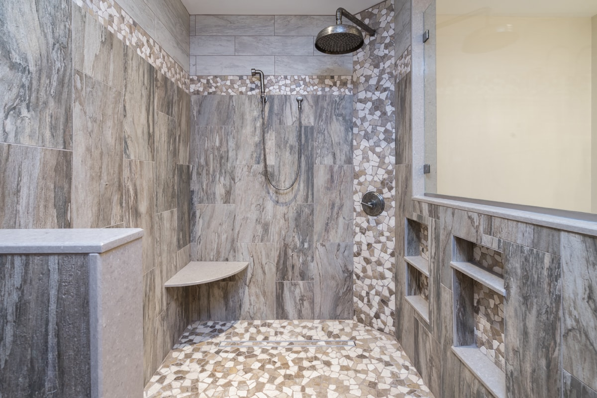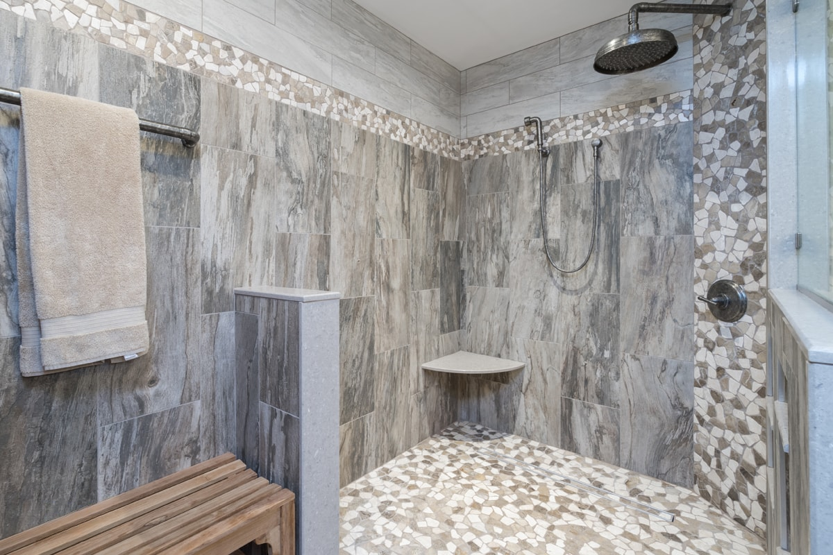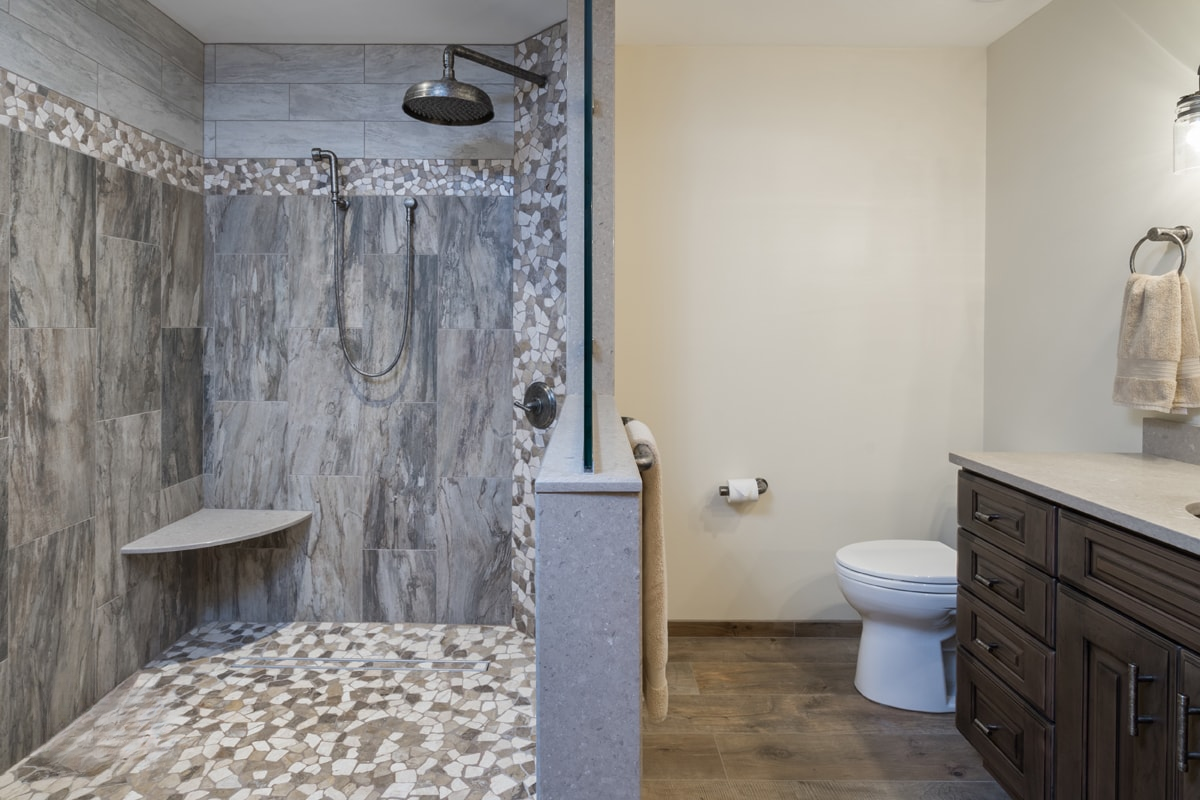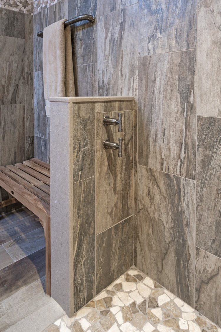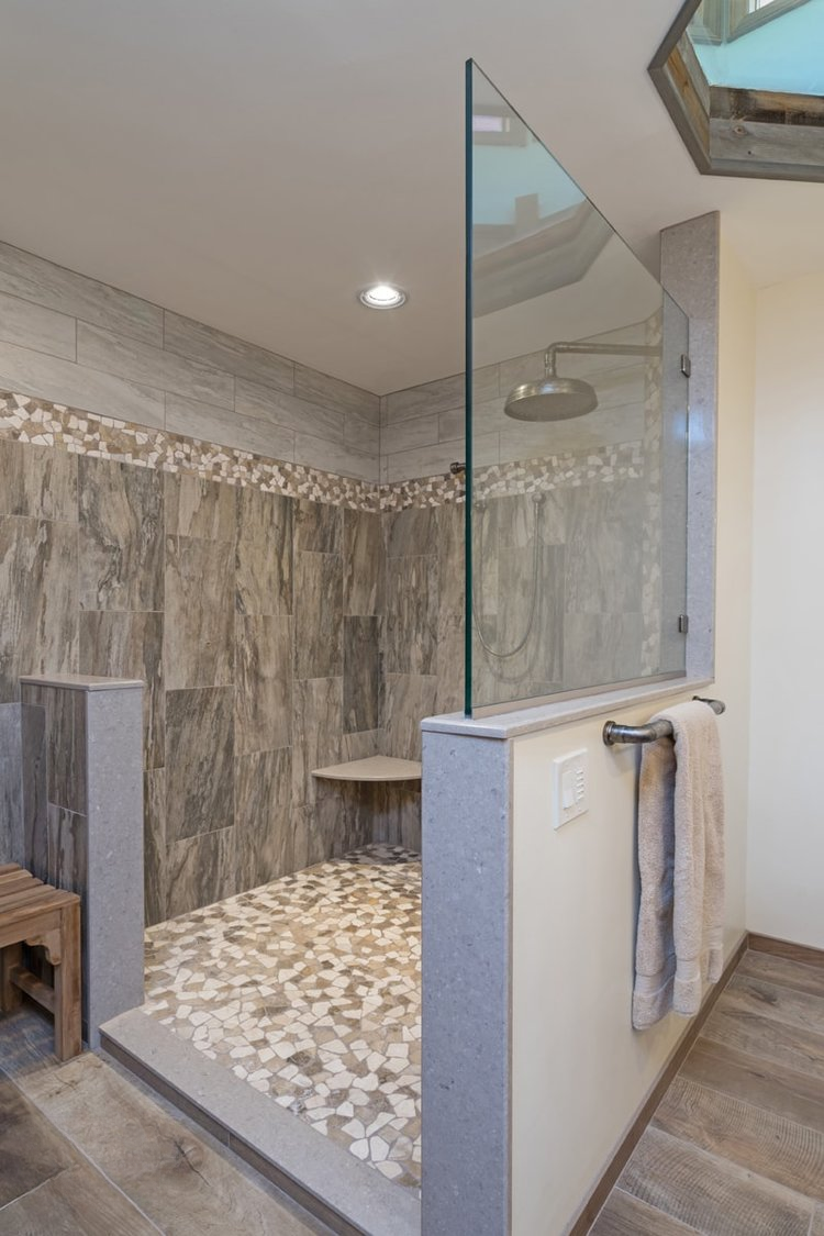 This bathroom design includes rustic and industrial features in a space that is unique, stylish, and relaxing. The master bath maximizes the space it occupies in the center of this unique octagonal-shaped house by creating an internal skylight that opens up to a high ceiling above the bathroom in the center of the home. It creates an architectural feature and also brings natural light into the room. The DuraSupreme vanity cabinet in a distressed finish is accented by a Caesarstone engineered quartz countertop and eye-catching Sonoma Forge Waterfall spout faucet. A thresholdless shower with a rainfall showerhead, storage niches, and a river rock shower floor offer a soothing atmosphere.