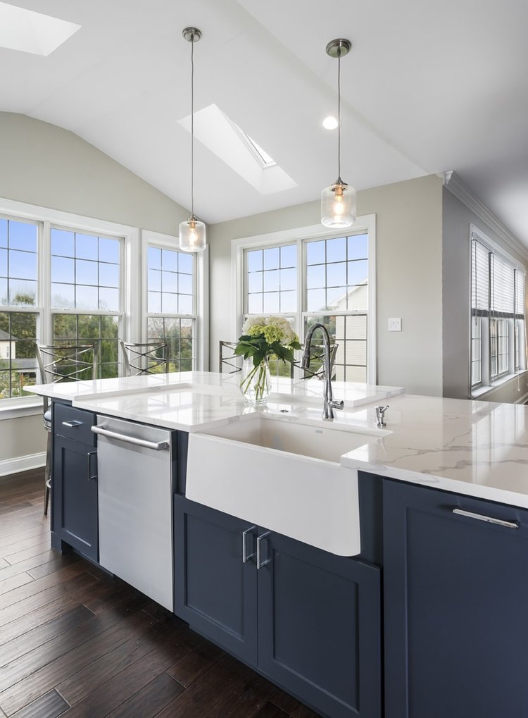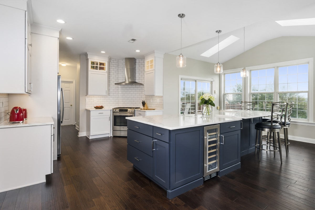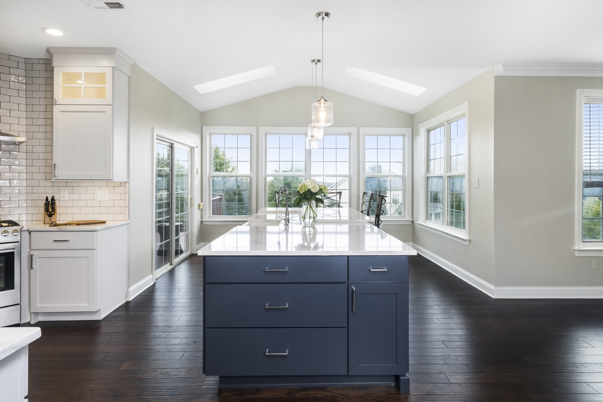 This spacious kitchen design in Yardley is a bright, open plan space bathed in natural light from the large windows, doors, and skylights. The white perimeter cabinets from Koch and Company are complemented by handmade subway tile and MSI Surfaces Calcatta Venice quartz countertop. The white color scheme is beautifully contrasted by blue island cabinetry with a bi-level countertop and barstool seating. The island also includes a Task Lighting angled power strip, a narrow wine refrigerator, and a white Blanco Siligranit apron front sink with a Riobel Edge faucet and chrome soap dispenser. The kitchen cabinets are accented by Top Knobs Lydia style pulls in chrome. Bosch stainless appliances feature throughout the kitchen, including a microwave drawer and a Bosch stainless chimney hood. Dark hardwood flooring from Meridian brings depth to the style. The natural lighting is complemented by pendant lights from Wage Lighting, undercabinet lighting, and upper glass front cabinets with in cabinet lighting.