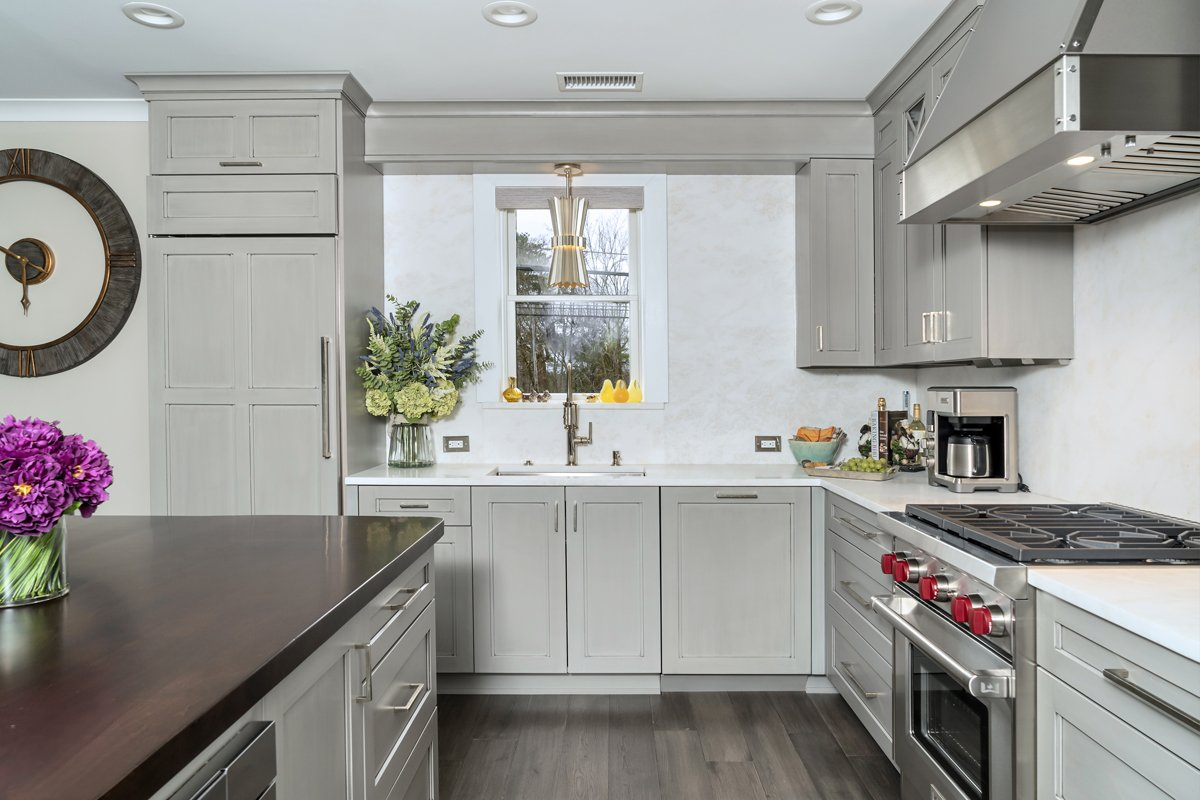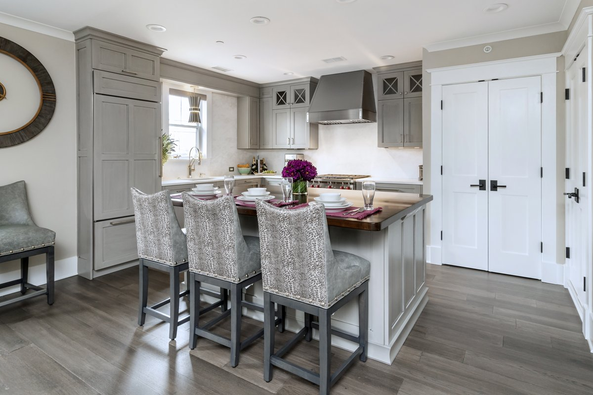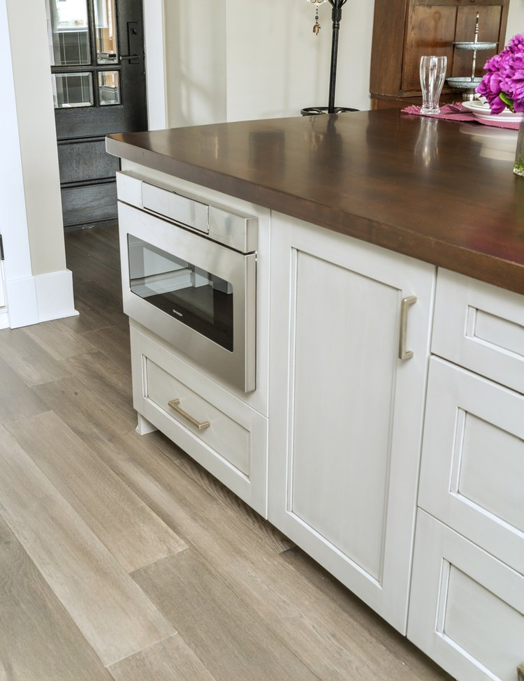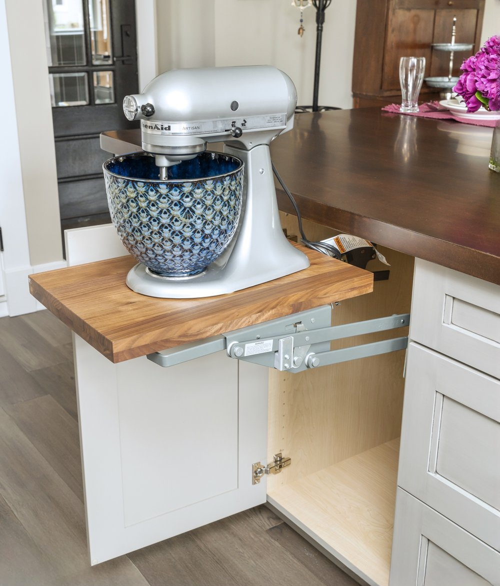 The kitchen design in this Furlong, PA home is part of an open plan layout. It features a central island, a pro-style range, customized storage solutions, and beautiful lighting and accessories. Luxury vinyl flooring is a stylish and practical choice that is easy to clean and maintain. Storage accessories include deep drawers, a cutlery drawer, and a mixer lift cabinet.