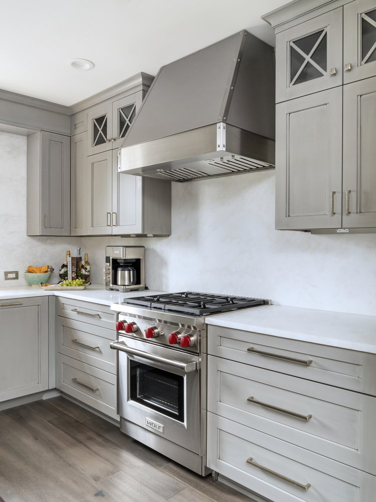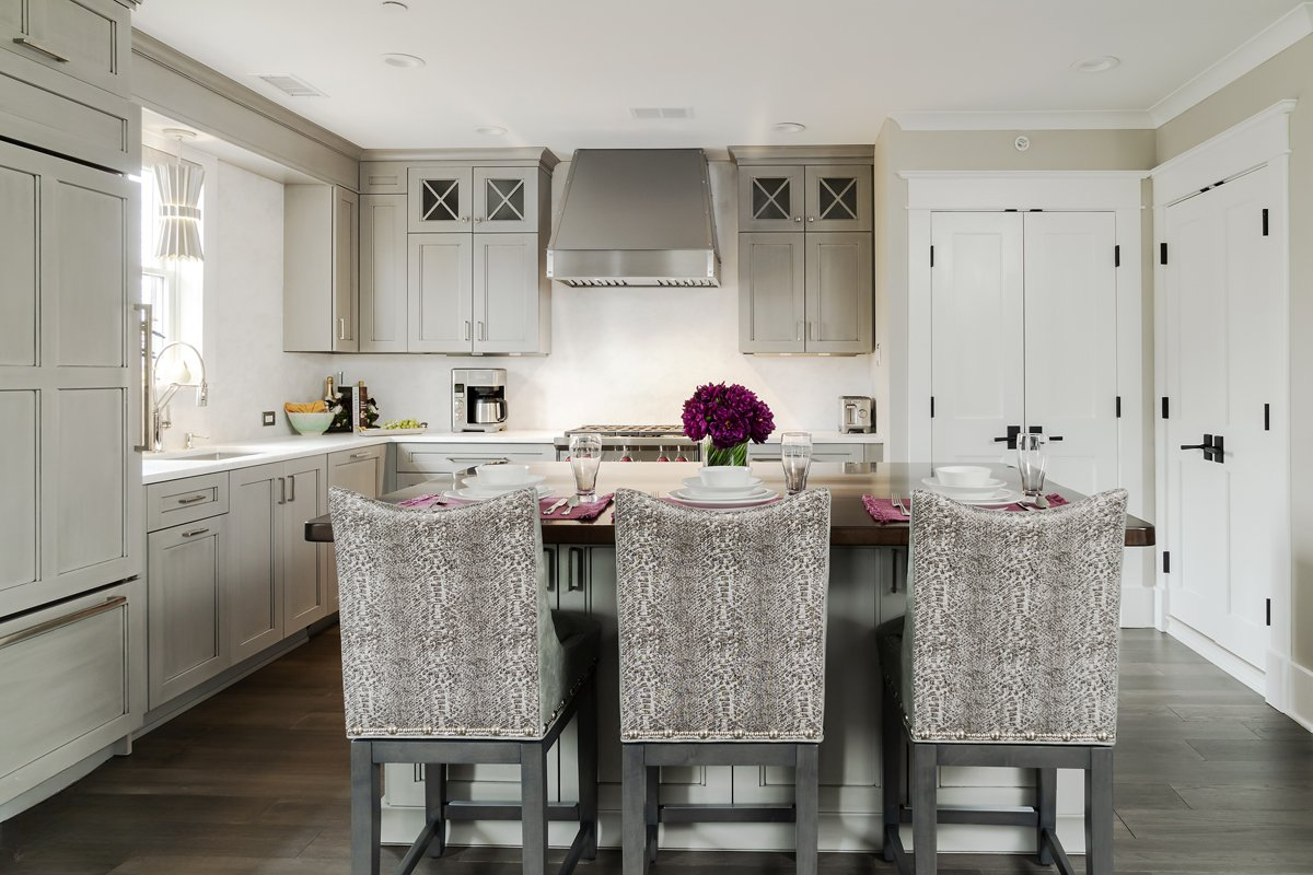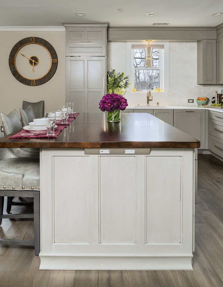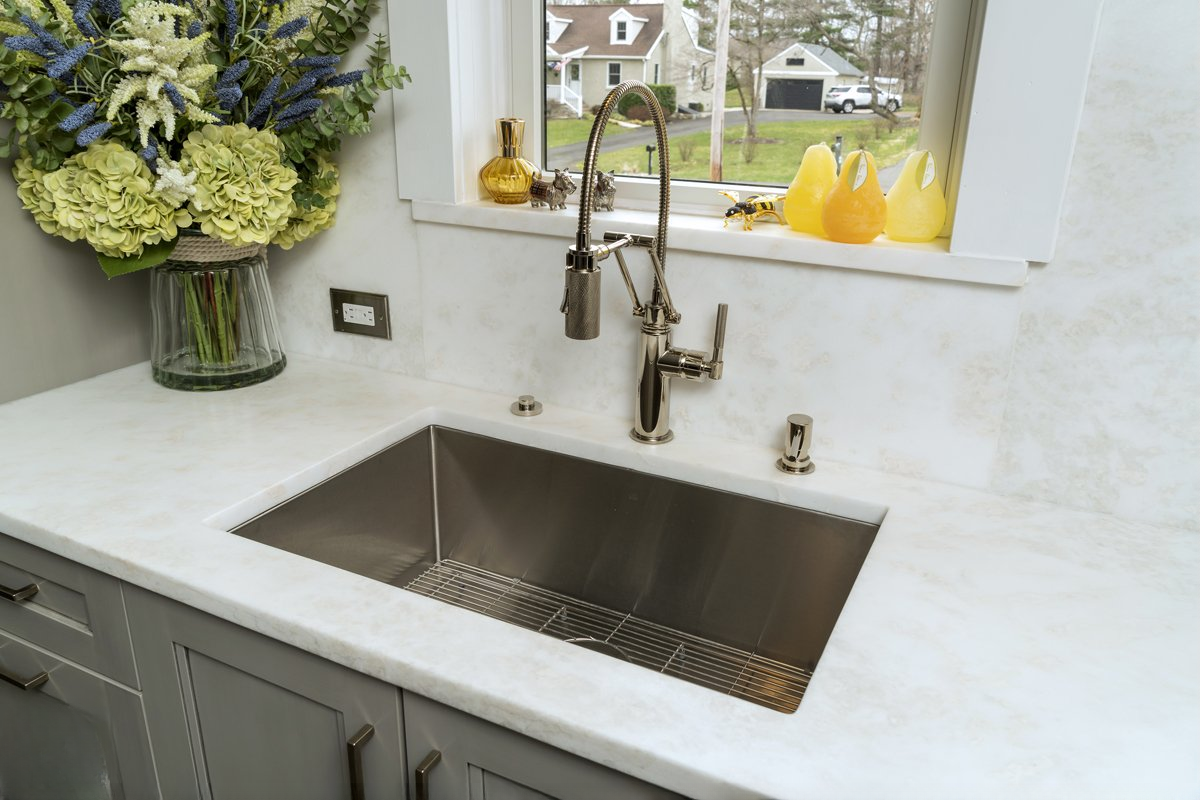 The kitchen design in this Furlong, PA home is part of an open plan layout. It features a central island, a pro-style range, customized storage solutions, and beautiful lighting and accessories. Luxury vinyl flooring is a stylish and practical choice that is easy to clean and maintain. Storage accessories include deep drawers, a cutlery drawer, and a mixer lift cabinet.