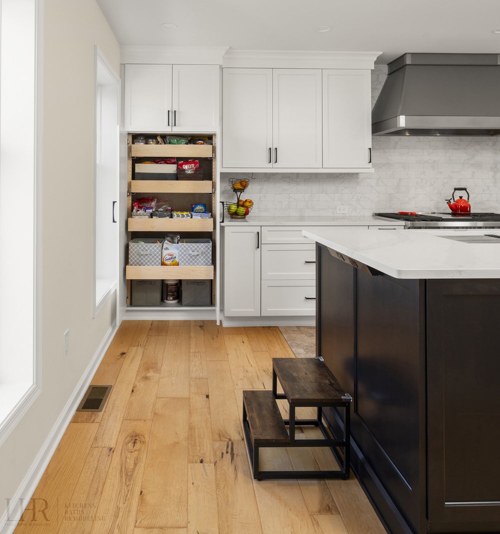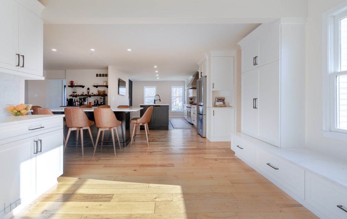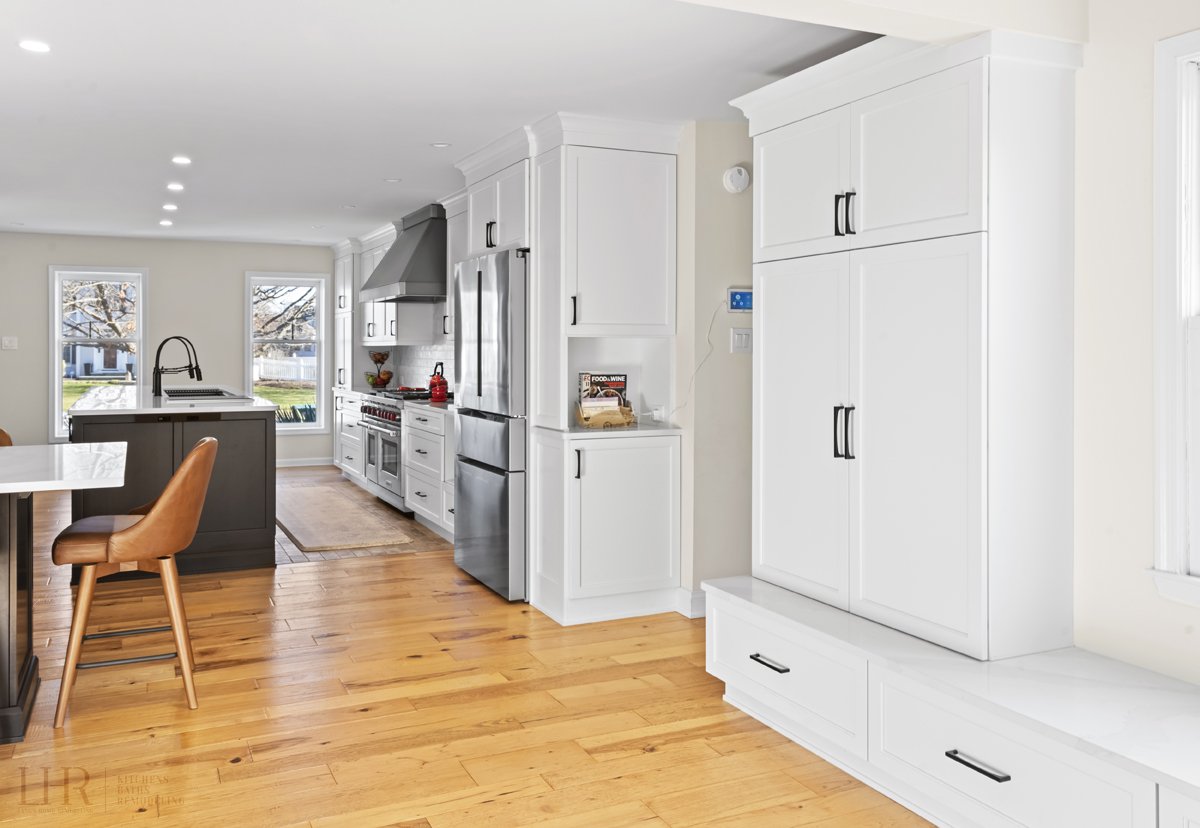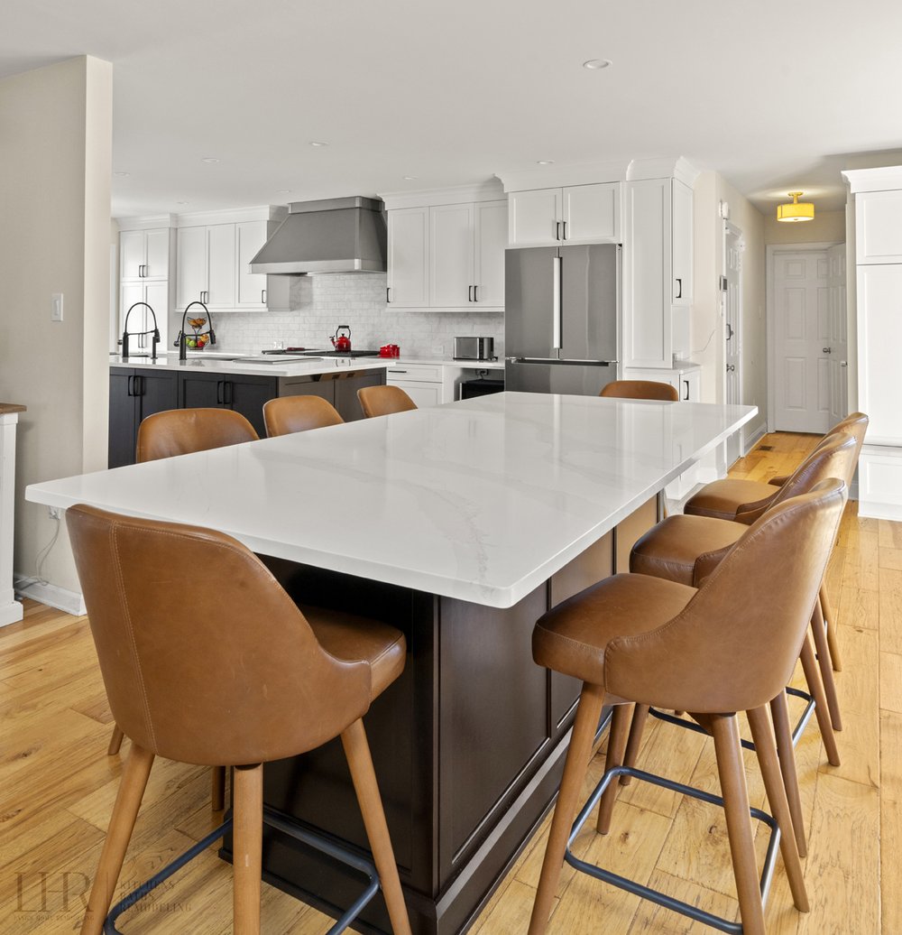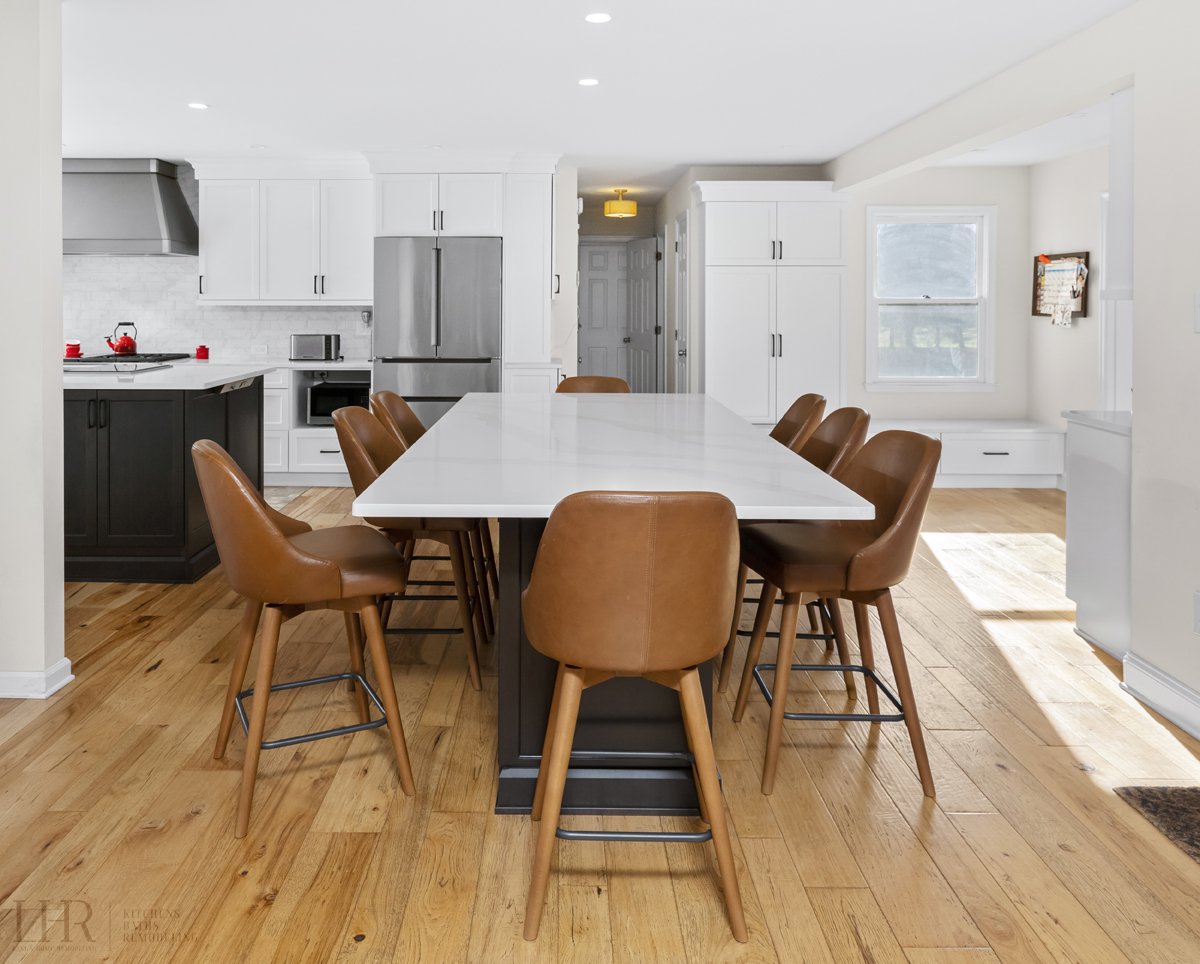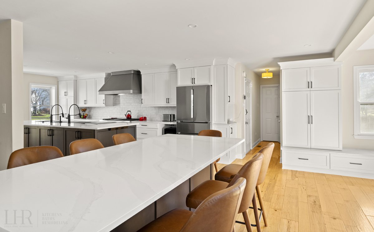 This Yardley, PA kitchen design created a new, large open plan space by removing the center wall of the house between the kitchen and the old dining room. This allowed us to design a bright, spacious kitchen with two large islands, one for food preparation and one for dining. The main food preparation island incorporates a Galley Workstation with two faucets, which creates a multi-functional work zone at the heart of the kitchen. This pairs with a 48” Wolf range, a Stoll Industries custom hood, and brick tile for a cooking area that is as stylish as it is functional. Dark wood island cabinets and white perimeter cabinets combine for a striking aesthetic, paired with durable quartz countertops and matte black hardware. The second island includes seating for six, creating the perfect spot for family dinners or entertaining friends. The client also requested a customized boot bench area where the kids can neatly stow shoes, backpacks, and jackets when they get home. The balance of functionality and style in this kitchen creates the perfect space for family and friends to gather!