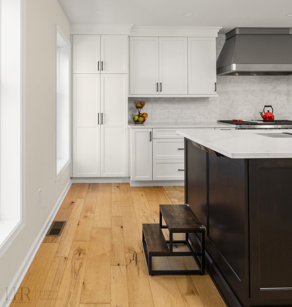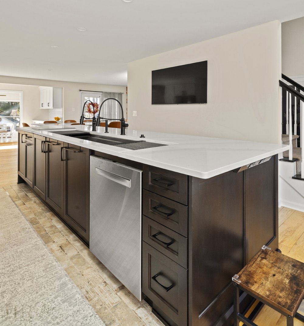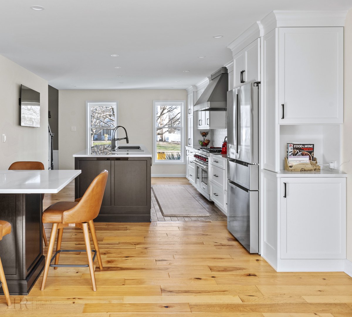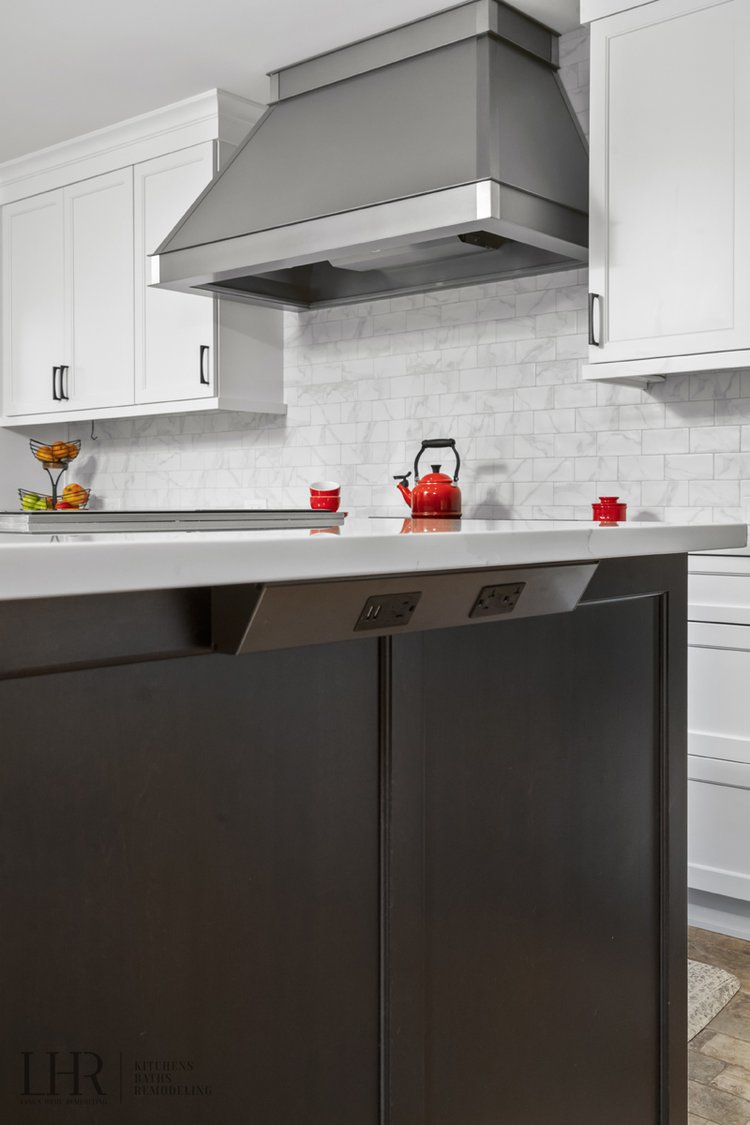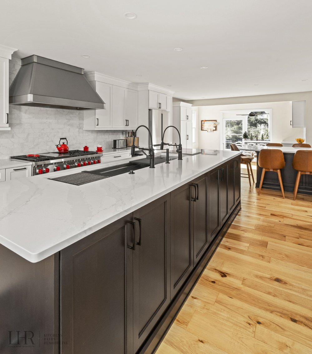 This Yardley, PA kitchen design created a new, large open plan space by removing the center wall of the house between the kitchen and the old dining room. This allowed us to design a bright, spacious kitchen with two large islands, one for food preparation and one for dining. The main food preparation island incorporates a Galley Workstation with two faucets, which creates a multi-functional work zone at the heart of the kitchen. This pairs with a 48” Wolf range, a Stoll Industries custom hood, and brick tile for a cooking area that is as stylish as it is functional. Dark wood island cabinets and white perimeter cabinets combine for a striking aesthetic, paired with durable quartz countertops and matte black hardware. The second island includes seating for six, creating the perfect spot for family dinners or entertaining friends. The client also requested a customized boot bench area where the kids can neatly stow shoes, backpacks, and jackets when they get home. The balance of functionality and style in this kitchen creates the perfect space for family and friends to gather!
