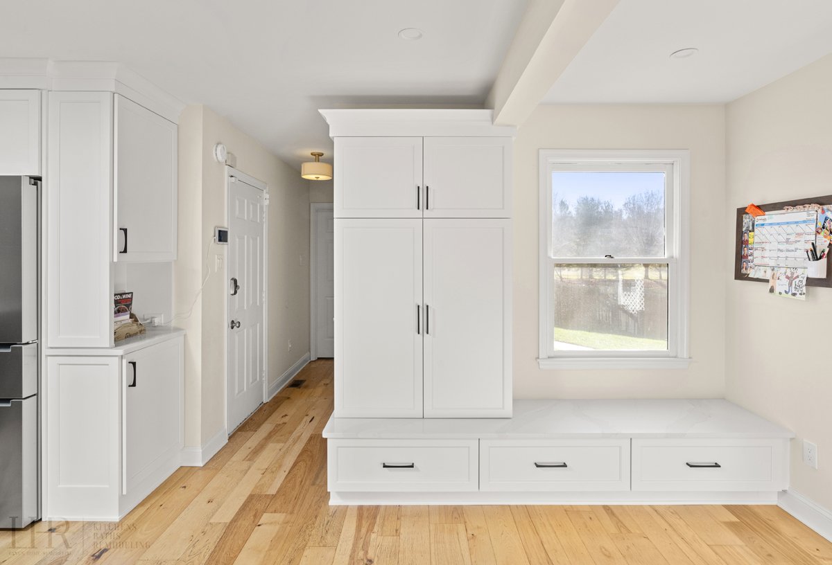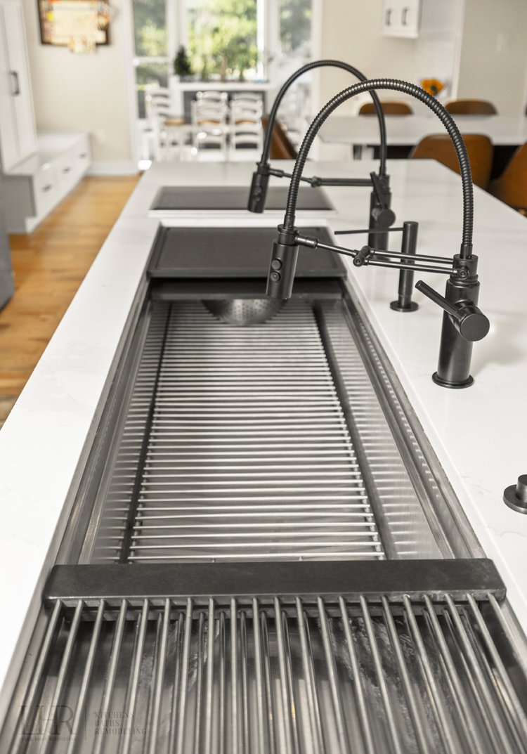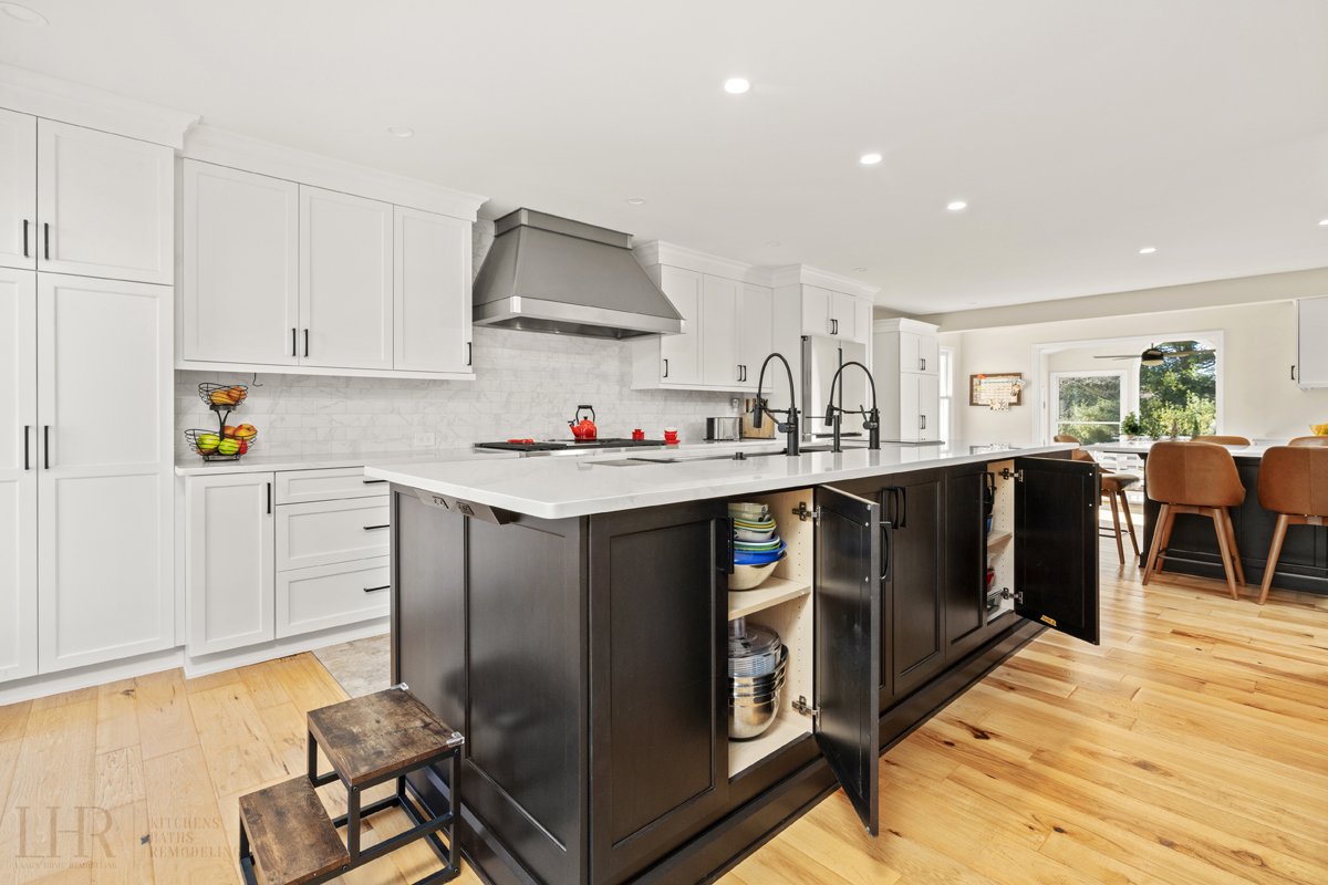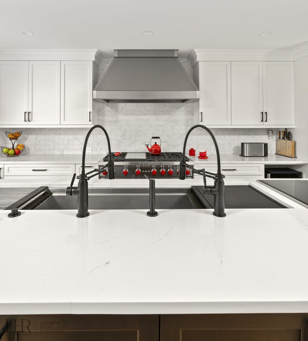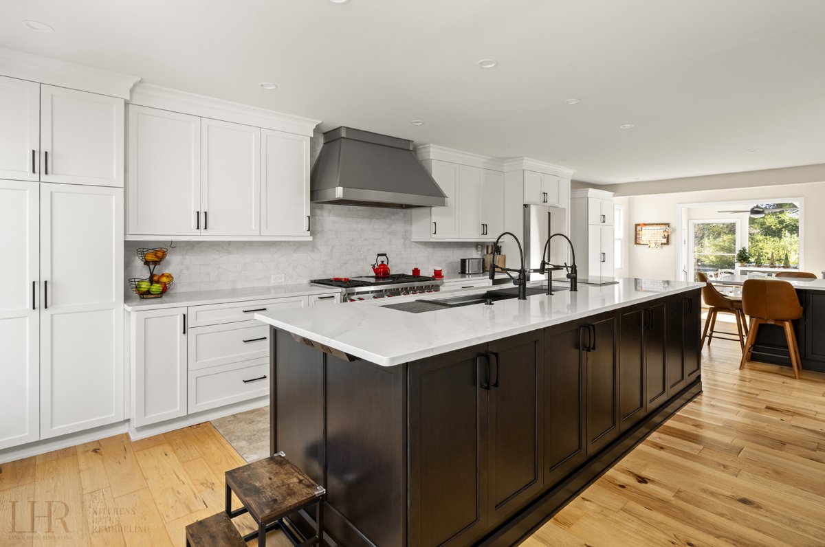 This Yardley, PA kitchen design created a new, large open plan space by removing the center wall of the house between the kitchen and the old dining room. This allowed us to design a bright, spacious kitchen with two large islands, one for food preparation and one for dining. The main food preparation island incorporates a Galley Workstation with two faucets, which creates a multi-functional work zone at the heart of the kitchen. This pairs with a 48” Wolf range, a Stoll Industries custom hood, and brick tile for a cooking area that is as stylish as it is functional. Dark wood island cabinets and white perimeter cabinets combine for a striking aesthetic, paired with durable quartz countertops and matte black hardware. The second island includes seating for six, creating the perfect spot for family dinners or entertaining friends. The client also requested a customized boot bench area where the kids can neatly stow shoes, backpacks, and jackets when they get home. The balance of functionality and style in this kitchen creates the perfect space for family and friends to gather!