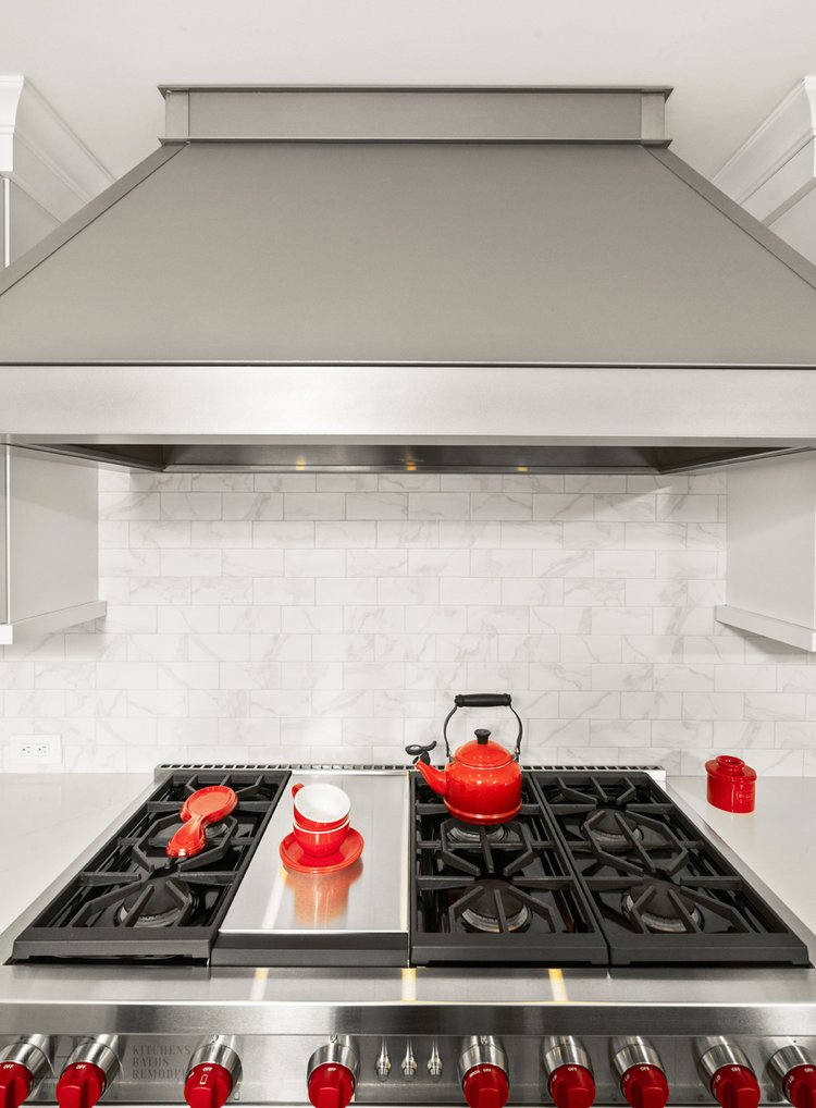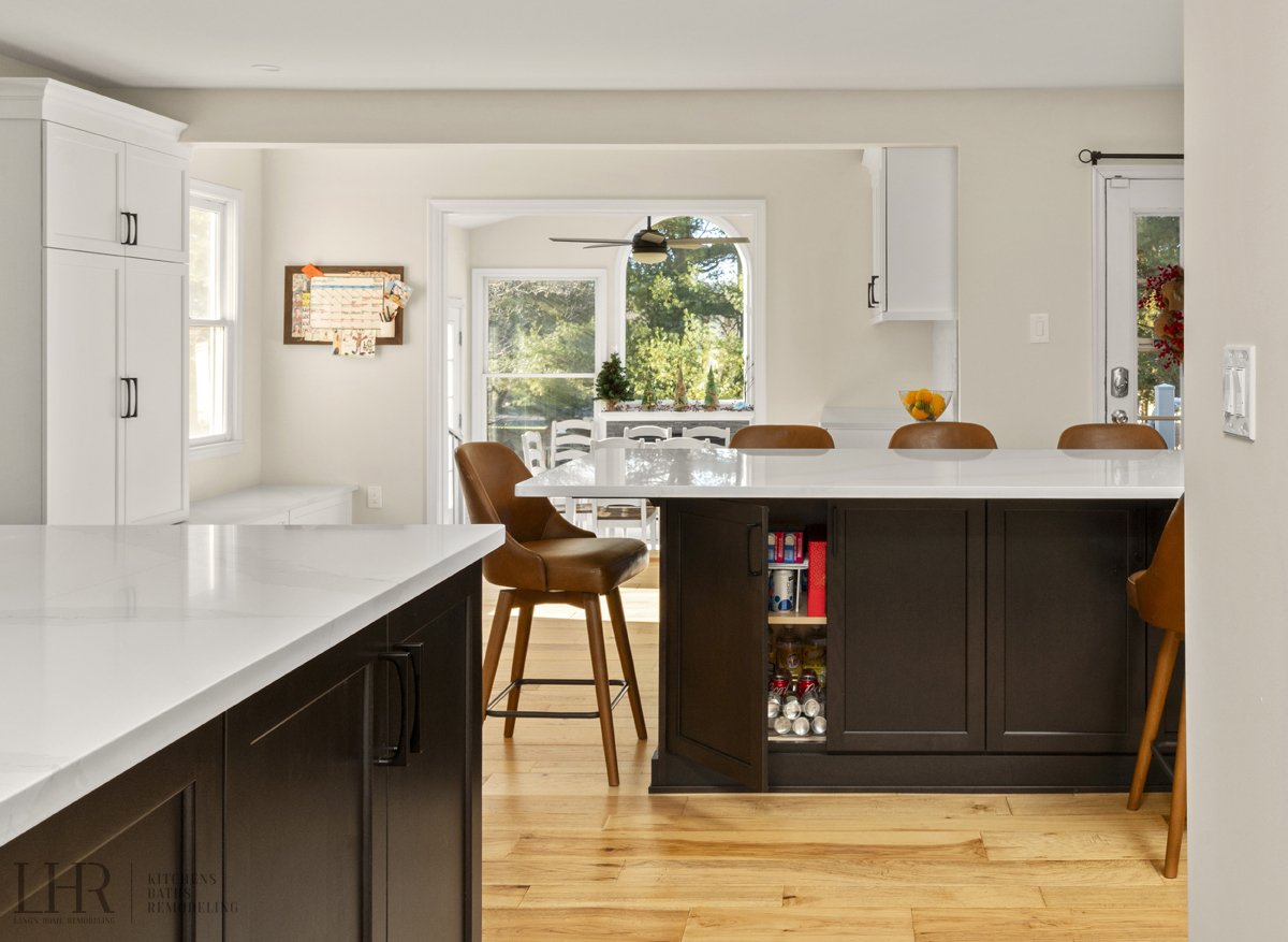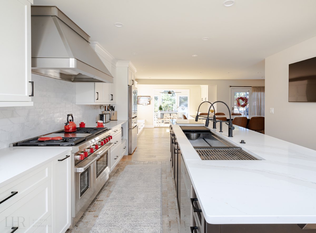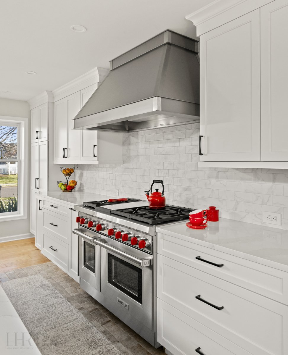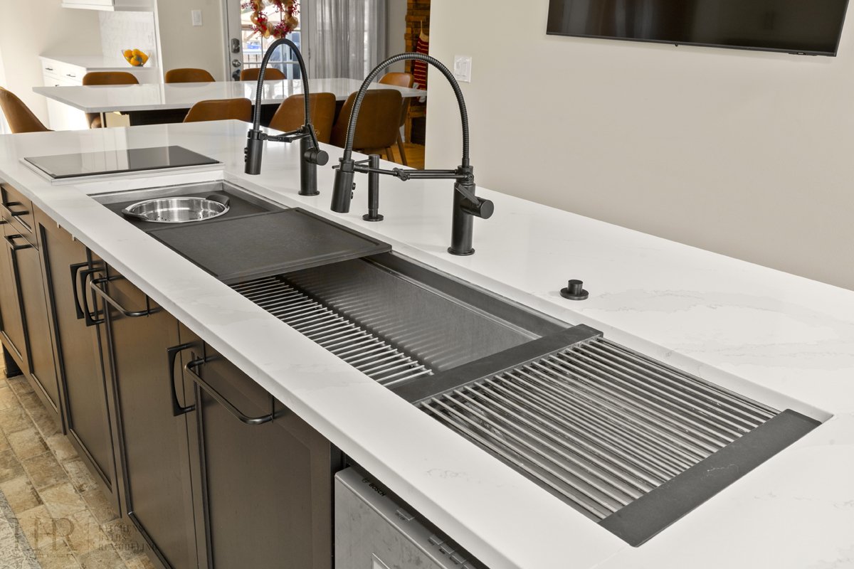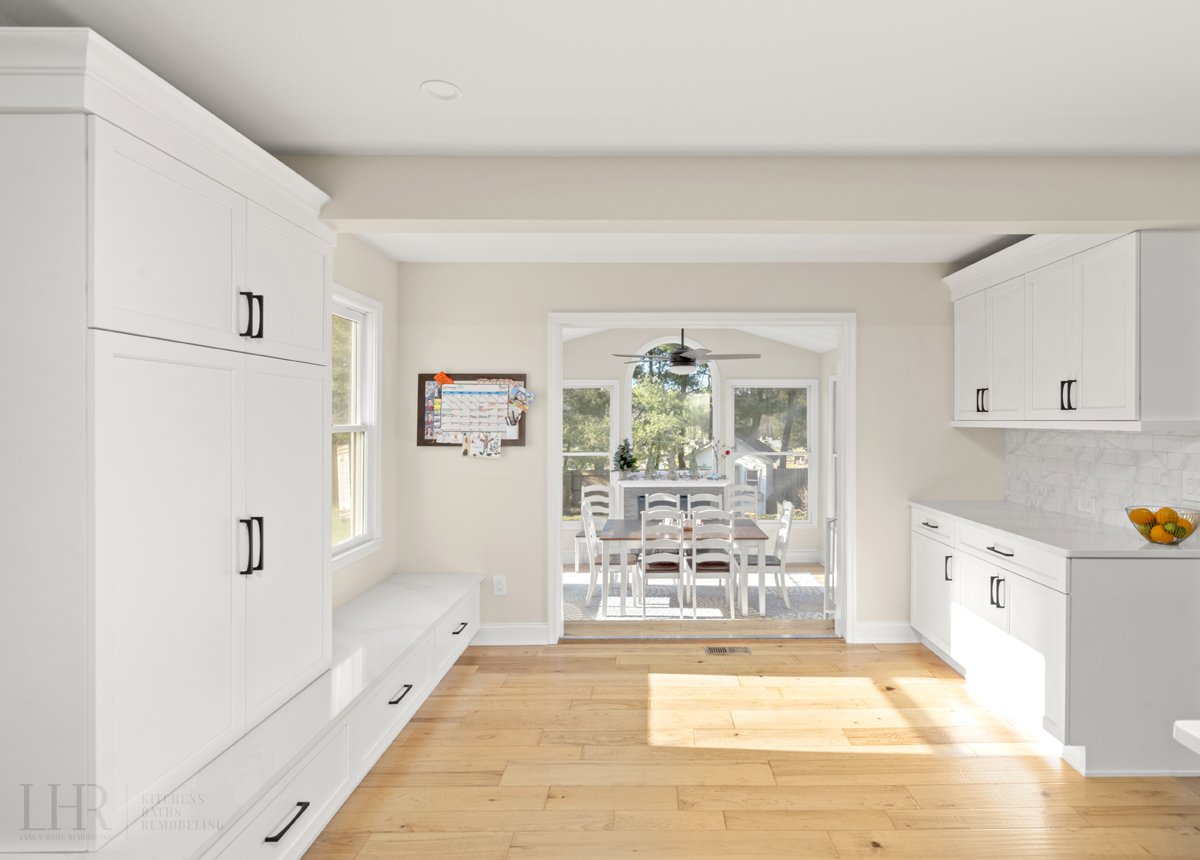 This Yardley, PA kitchen design created a new, large open plan space by removing the center wall of the house between the kitchen and the old dining room. This allowed us to design a bright, spacious kitchen with two large islands, one for food preparation and one for dining. The main food preparation island incorporates a Galley Workstation with two faucets, which creates a multi-functional work zone at the heart of the kitchen. This pairs with a 48” Wolf range, a Stoll Industries custom hood, and brick tile for a cooking area that is as stylish as it is functional. Dark wood island cabinets and white perimeter cabinets combine for a striking aesthetic, paired with durable quartz countertops and matte black hardware. The second island includes seating for six, creating the perfect spot for family dinners or entertaining friends. The client also requested a customized boot bench area where the kids can neatly stow shoes, backpacks, and jackets when they get home. The balance of functionality and style in this kitchen creates the perfect space for family and friends to gather!